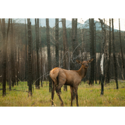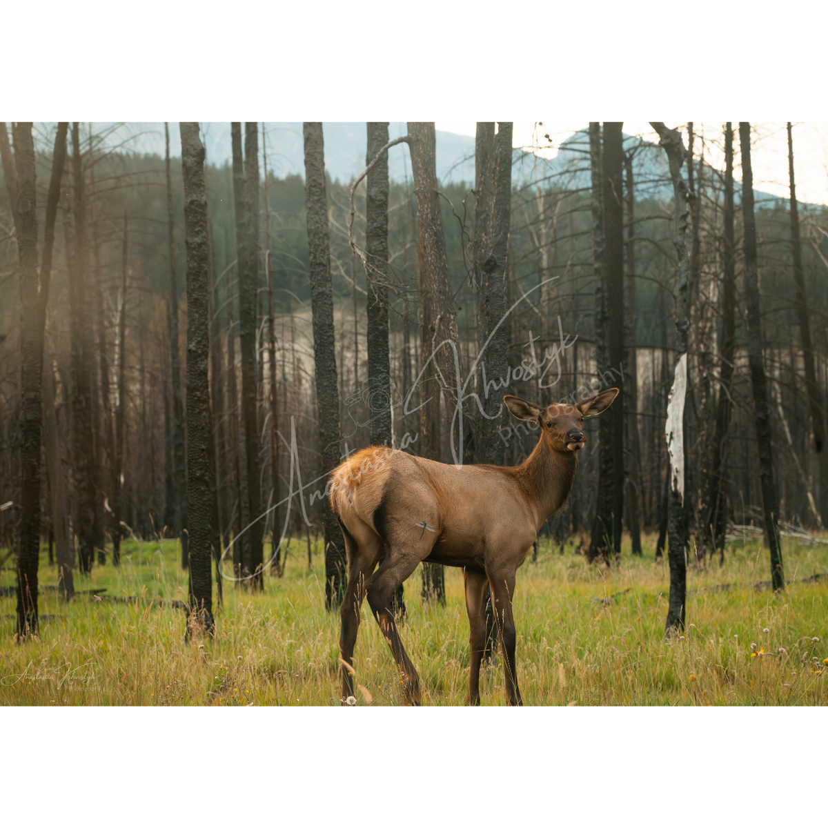 Ember Forest captures the quiet resilience of nature through the graceful presence of an elk standing amidst the charred remains of a once-dense forest. The soft morning light filters through the mist and blackened trunks, illuminating new green growth at the animal’s feet — a powerful reminder of renewal and endurance. Every detail, from the elk’s poised stance to the gentle contrast between life and rebirth, evokes a deep sense of calm and reverence for the wild.