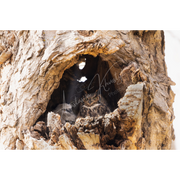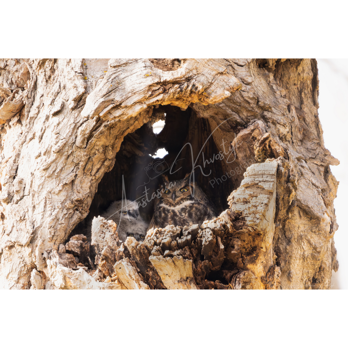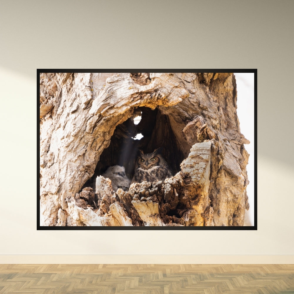Sanctuary in Wood captures a Great Horned Owl and its owlet nestled within the hollow of an old tree — a quiet moment of protection and grace. The natural textures and soft woodland light evoke the serenity of untouched wilderness.